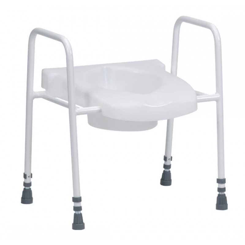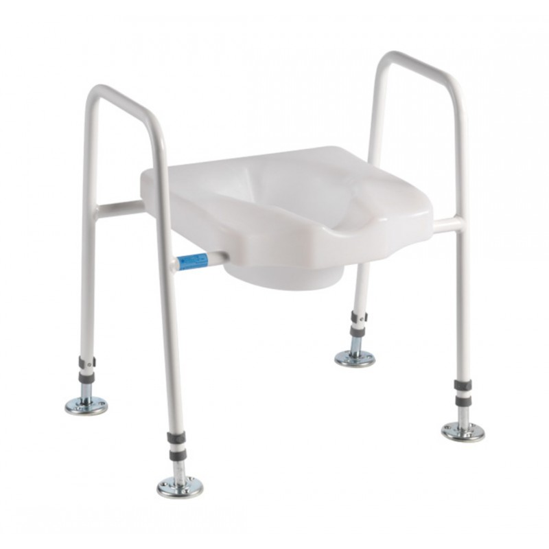 Frame with supportive armrests and integral seat designed to raise height of existing toilet to ease sitting down and standing up.