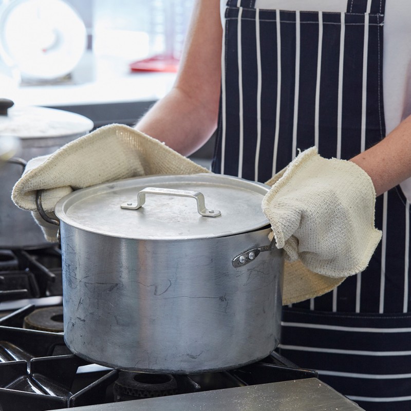 A thick, professional quality oven glove with unique double-sided pockets for extra insulation.