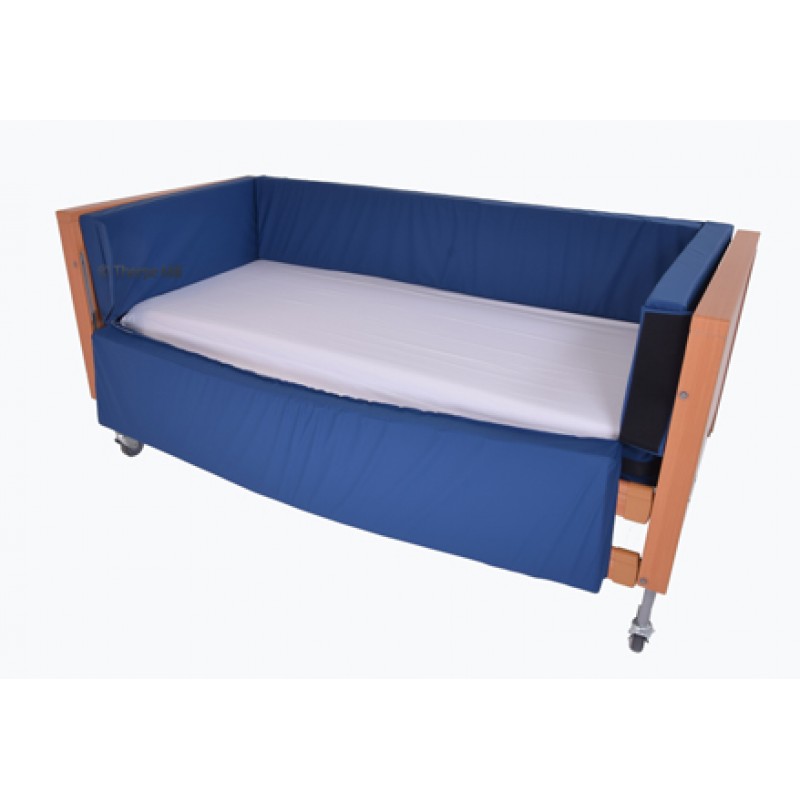 All four walls are connected with a base sheet, the mattress sits on top of the base sheet to prevent limbs falling through under the rails.
