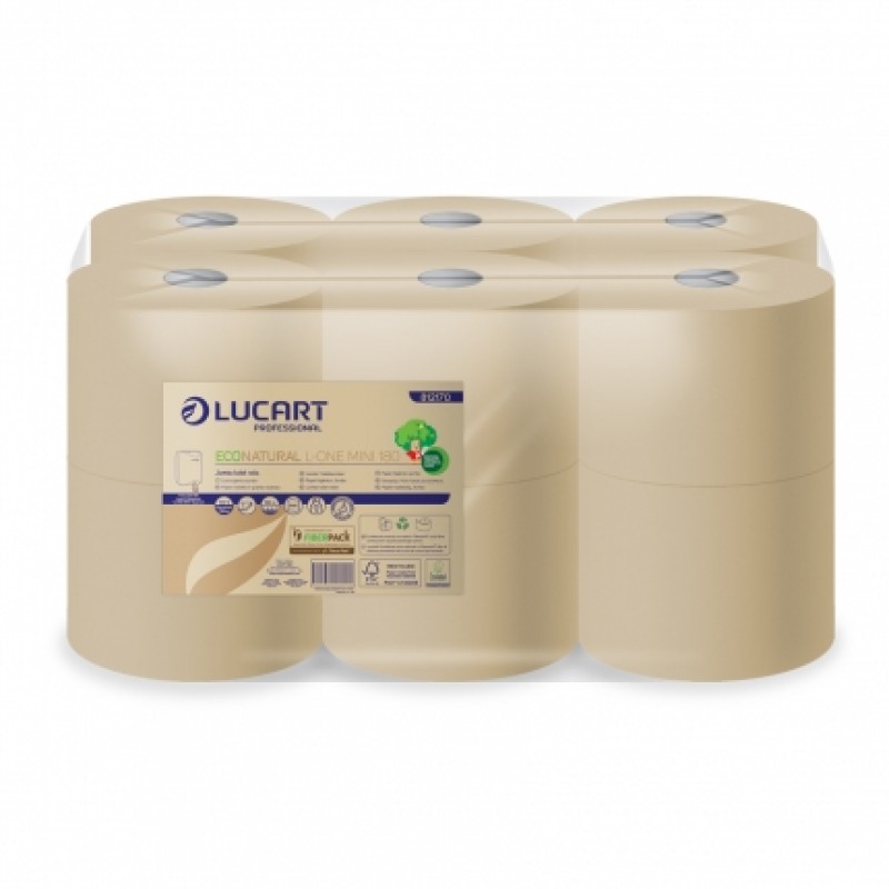 Lucart EcoNatural L-ONE Mini centrefeed toilet roll is made from 100% recycled drinks cartons. Large sheet size (13.4 x 20cm) means that less tissue is taken overall, reducing consumption. 900 sheets on a roll (180 meters), keeping maintenance calls to a minimum. FSC and EU Ecolabel certified.