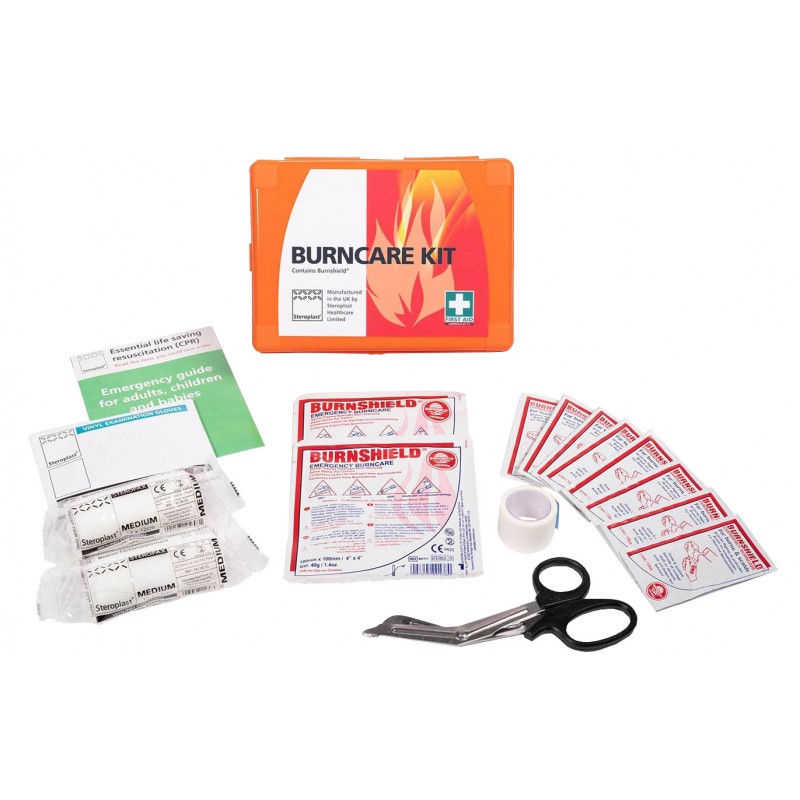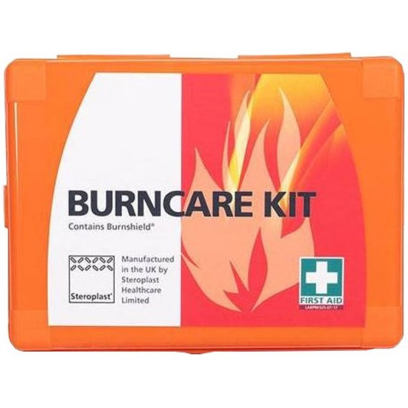 Easy to store burns care kit that provides essential physical protection and instant cooling for someone who has suffered a burn.
