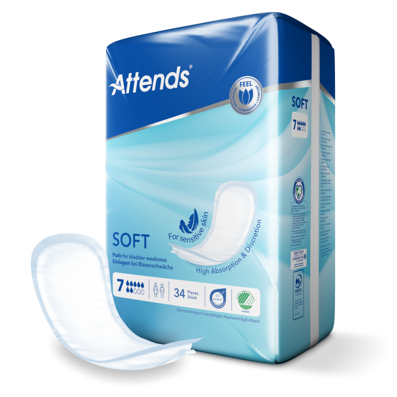 Attends Soft 7 are discreet absorbent pads designed to manage heavy bladder weakness, specially developed for sensitive skin.