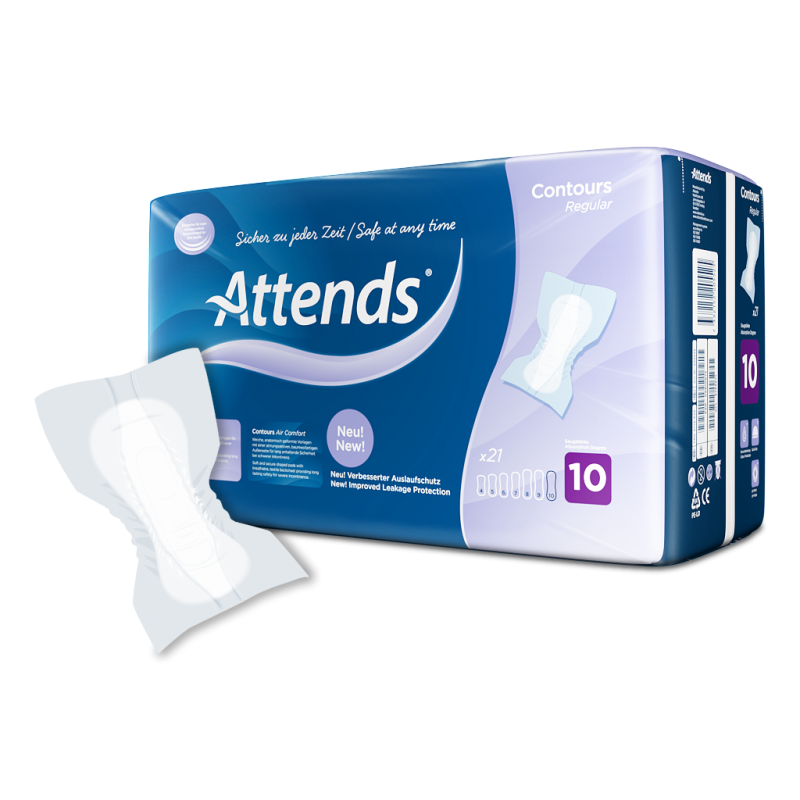 Attends Contours Regular 10 are body shaped pads designed to manage heavy bladder or bowel incontinence (urinary or faecal incontinence). This pad is designed to fit close to the body for extra comfort and leakage protection even when experiencing multiple gushes. Wetness indicator on the back sheet helps individuals and carers get the most from each pad.