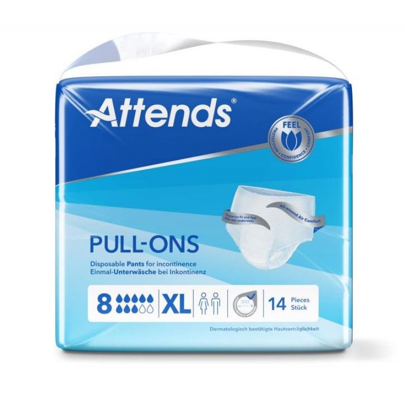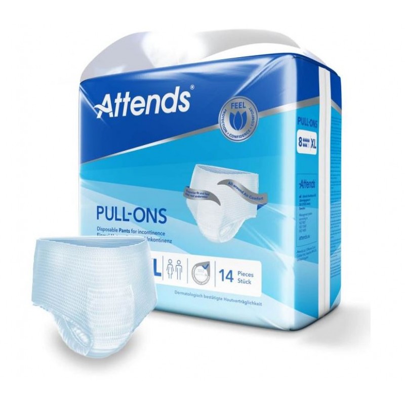 Attends Pull-On 8 extra-large are absorbent disposable pants designed to manage heavy bladder and/or bowel incontinence (urinary/faecal). These pants look like regular underwear to help you feel confident throughout the day and can be worn without any other underwear required. The pants have a flexible shape which fit close to the body and an absorbent core to help reduce the risk of leakage.
