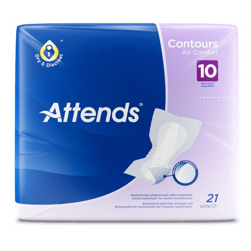 Attends Contours Air Comfort 10 are body shaped pads designed to manage heavy urinary and/or faecal incontinence. This pad is designed to fit close to the body for extra comfort and leakage protection. Contours Air Comfort 9 have a soft textile backsheet making the product quiet and discreet.