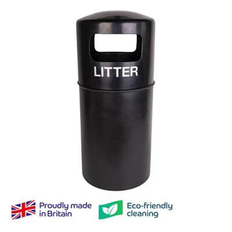 A litter bin, hooded lid and plastic liner made in the UK out of 100% recycled hardwearing polyethylene. Designed to complement street furniture, the 90L Eco Litter Bin features chamfered edges so the rubbish is directed into the liner, which is easily removeable for emptying and cleaning. The bin is suitable for both indoor and outdoor use and requires minimal maintenance.