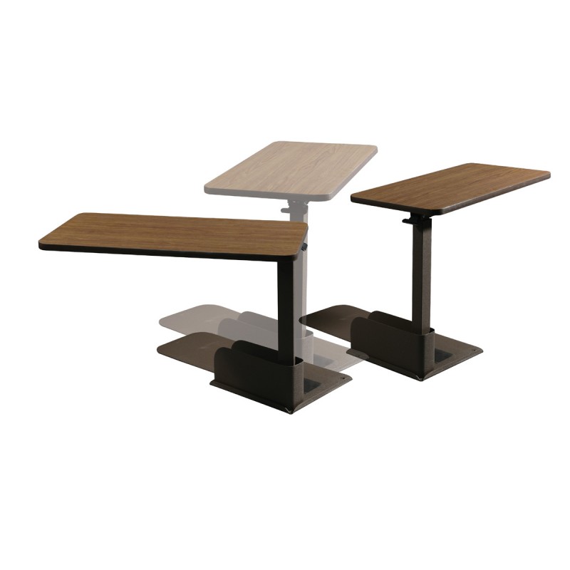 Table top pivots a full 360° at the touch of a hand allowing easy transferring to and from the chair
