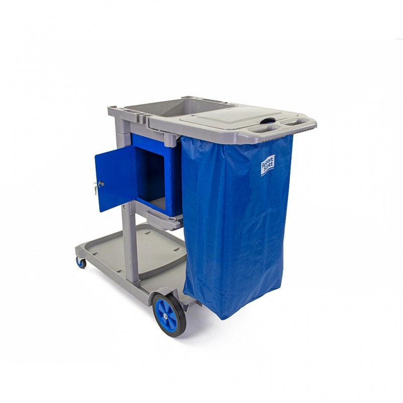 It has three levels of shelving for storage and transport of cleaning items, and a built-in hanger for waste bags.