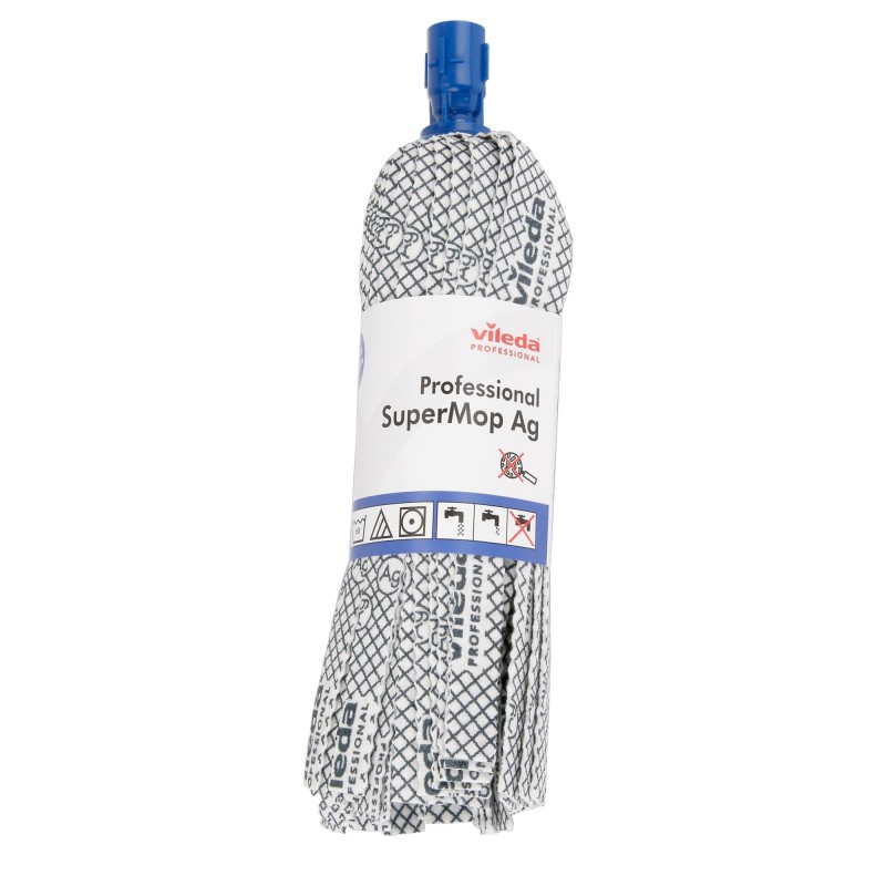 During production, silver is added to the cloth and during use these silver ions come into direct contact with bacteria inhibiting the growth (bacteriostatic activity) on the mop by 99.99%. Compared with the previous mop generation, the new SuperMop Ag picks up 30% more loose dirt, is 5% more absorbent and has a more even water release; reducing streaking and allows floors to dry quicker and more evenly.